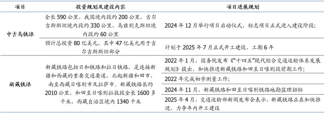 1)重大交通项目:《“十四五”铁路发展规划》提出,“认真贯彻落实习近平总书记解决我国西部铁路‘留白’太大问题的重要指示精神,加强战略骨干通道,构建多向入藏通道,完善新疆对外通道,加快边境地区铁路建设”,中吉乌铁路、新藏铁路等重点项目加速推进。中吉乌铁路全长590公里,中国/吉尔吉斯斯坦/乌斯别克斯坦境内段分别约200/330/60公里,预计总投资80亿美元(其中47亿美元用于吉尔吉斯斯坦部分)。2024年12月项目举行启动仪式,进入建设阶段,计划2025年7月正式开工,工期6年。新藏铁路北起新疆和田市,南至西藏日喀则市及拉萨市,是连接新疆和西藏的重要交通要道,长约2010公里,其中和田至日喀则拉孜段全长1600多公里,预计投资额960亿元。2022年和田至日喀则段写入《“十四五”现代综合交通运输体系发展规划》,2024年11月进行地勘监理招标,2025年4月交通运输部新闻发布会表示,新藏铁路正在加快推进,力争年内开工建设。