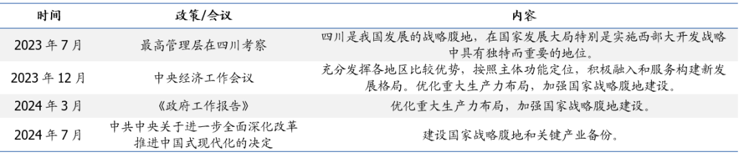 4)战略腹地:2023年7月,最高管理层在四川考察时指出“四川是我国发展的战略腹地,在国家发展大局特别是实施西部大开发战略中具有独特而重要的地位”;2023年12月中央经济工作会议首次提出“优化重大生产力布局,加强国家战略腹地建设”;2024年1月国务院关于《四川省国土空间规划(2021—2035年)》的批复中明确“四川省地处长江上游、西南内陆,是我国发展的战略腹地,是支撑新时代西部大开发、长江经济带发展等国家战略实施的重要地区”;2024年7月党的二十届三中全会再次强调“建设国家战略腹地和关键产业备份”。系列政策显示我国正加快推动建设国家战略腹地。国家战略腹地是指对国家战略目标的实现发挥支撑作用的非国家核心区域。