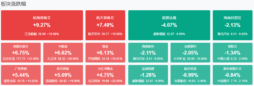 板块方面,军工、AI应用、商业航天等板块涨幅居前,能源金属、海南、燃气等板块跌幅居前。截至收盘,沪指涨0.05%,深成指涨0.37%,创业板指涨0.31%。
