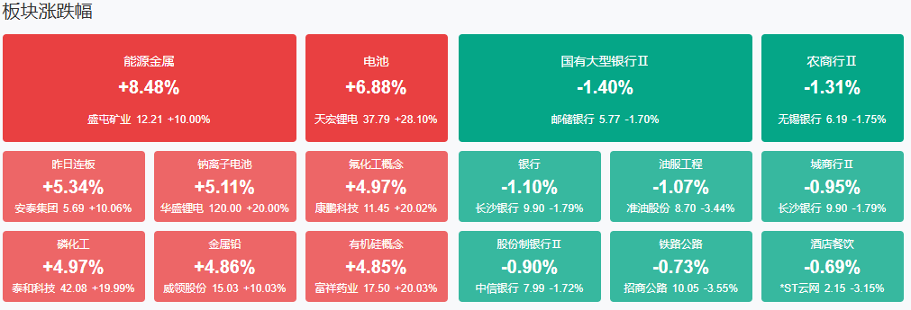 板块方面,能源金属、电池、磷化工等板块涨幅居前,油气、银行等板块跌幅居前。截至收盘,沪指涨0.44%,深成指涨1.8%,创业板指涨2.68%。