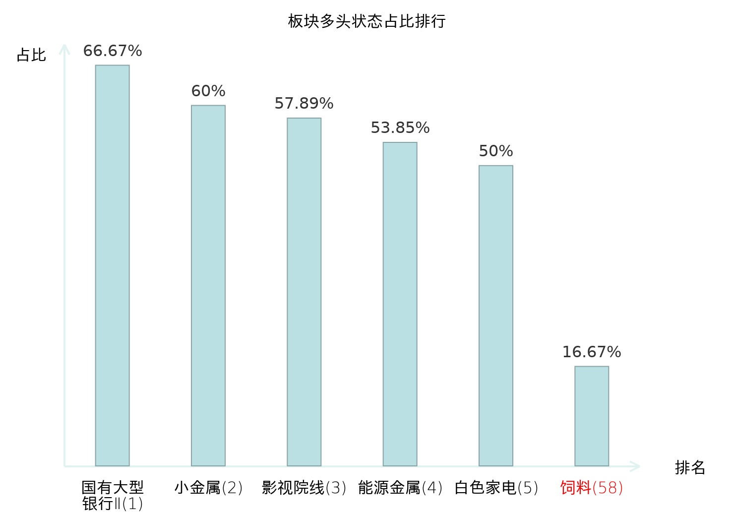 全市场所有行业板块中主力多头状态占比排名中,国有大型银行Ⅱ板块位居第一。装修装饰Ⅱ板块名次提升最快,较昨日上升48位。
