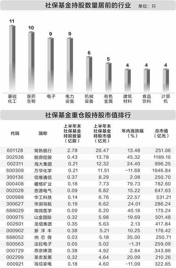 分行业来看,基础化工行业最受社保基金青睐,共11股获社保基金重仓,合计持股市值达到40.75亿元居于首位。医药生物、电子、电力设备行业持股数量紧随其后,分别为10股、9股、9股。
