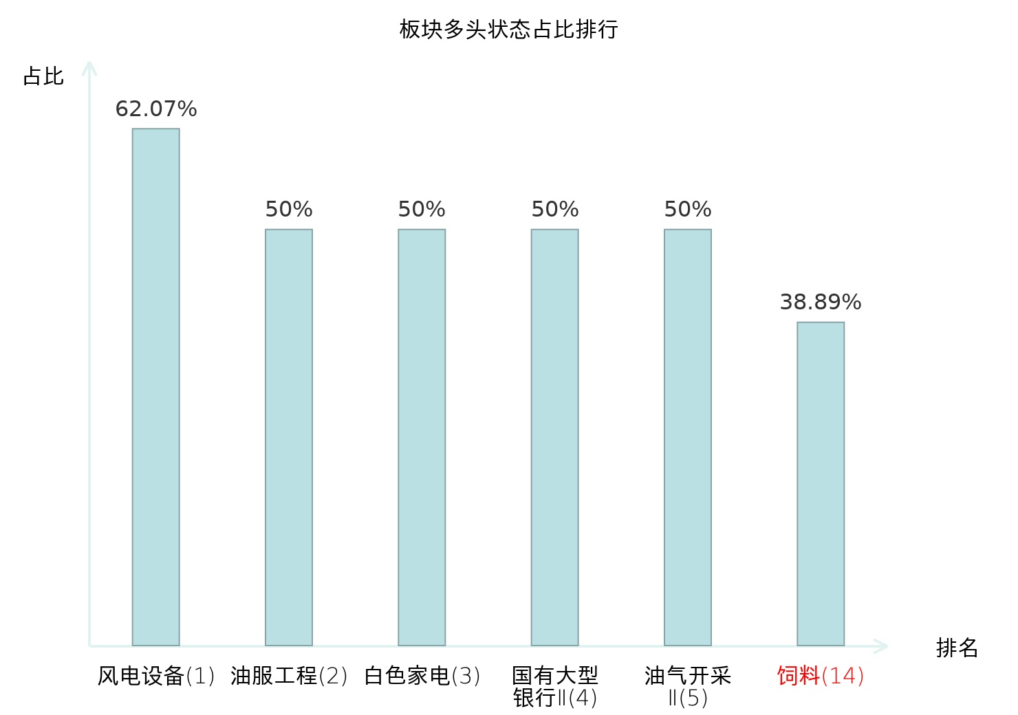 全市场所有行业板块中主力多头状态占比排名中,风电设备板块位居第一。动物保健Ⅱ板块名次提升最快,较昨日上升64位。