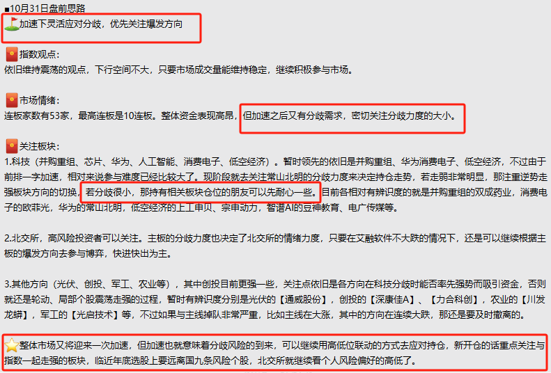 总结起来就是一句话就是,周五的时间节点比较好,不管分歧是否延续,重点优先关注周五最强爆发的分支方向,与指数一起走强且有消息面刺激的为最佳,而持仓就继续根据高低位联动的方式来应对。