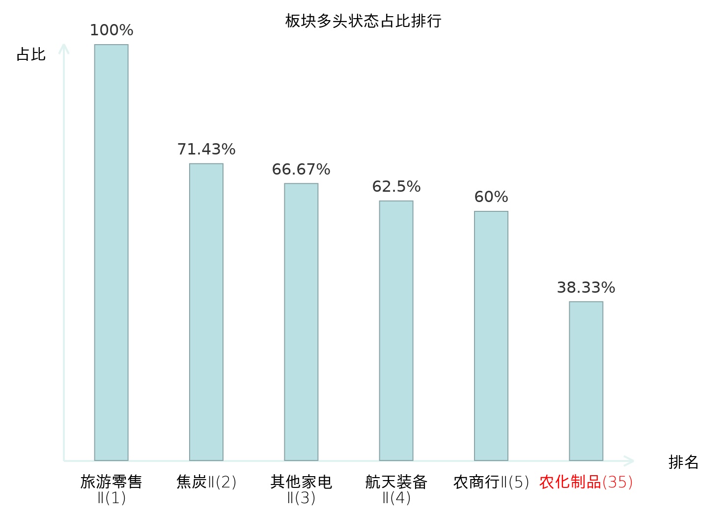 全市场所有行业板块中主力多头状态占比排名中,旅游零售Ⅱ板块位居第一。白酒Ⅱ板块名次提升最快,较昨日上升50位。