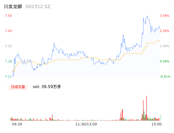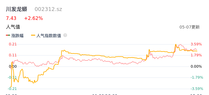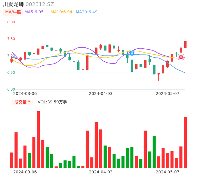 05月07日,川发龙蟒收报7.43,股价涨幅2.62%,成交金额2.92亿元,换手率2.90%。