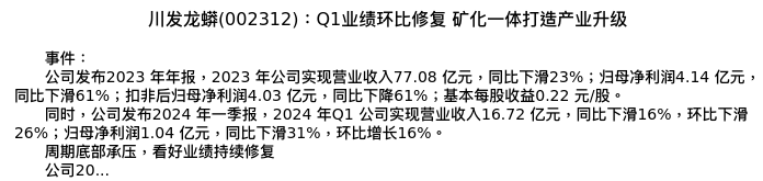 值得注意的是:2024年04月国联证券的郭荆璞分析师,首次发布关于川发龙蟒的研究报告,标题为:川发龙蟒(002312):Q1业绩环比修复 矿化一体打造产业升级。