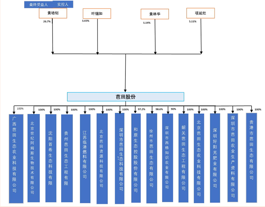 董事长兼总裁黄培钊是深圳市芭田生态工程股份有限公司的第一大股东,持有公司26.74%的股权,为公司实际控制人和最终受益人。股东黄林华与黄培钊之间存在一致行动人关系,共同持有公司27.88%的股份。公司股权结构稳定清晰,目前公司下设包括北京世纪阿姆斯生物、广西芭田、深圳首希、贵州芭田、贵港芭田、徐州芭田在内的20家子公司。