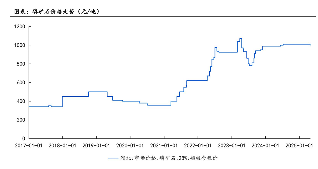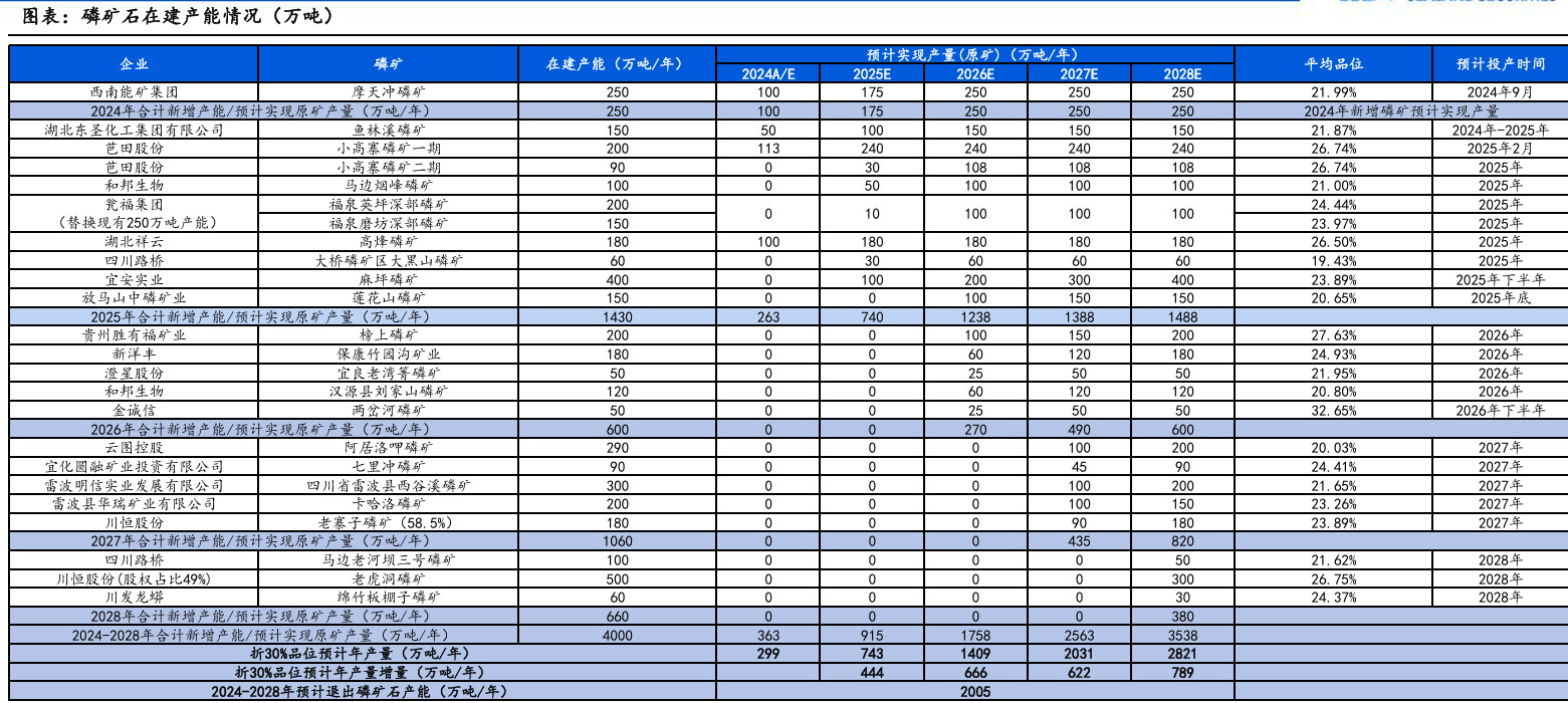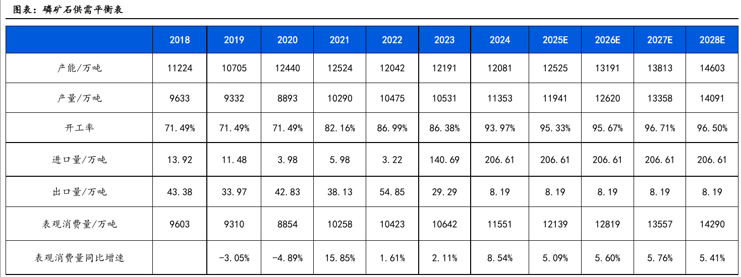 国内规划2025-2027年新增产能5895万吨/年,从26年开始,每年新增产能在1500万吨以上的磷矿石。但受环保审批和开采壁垒影响,实际投产进度可能不及预期。我们认为预计2026年后供需逐步宽松,但资源稀缺属性和开采审批问题,预期磷矿石的价格仍将保持在800元以上的价格区间,磷矿开采企业还将保持较高的利润。