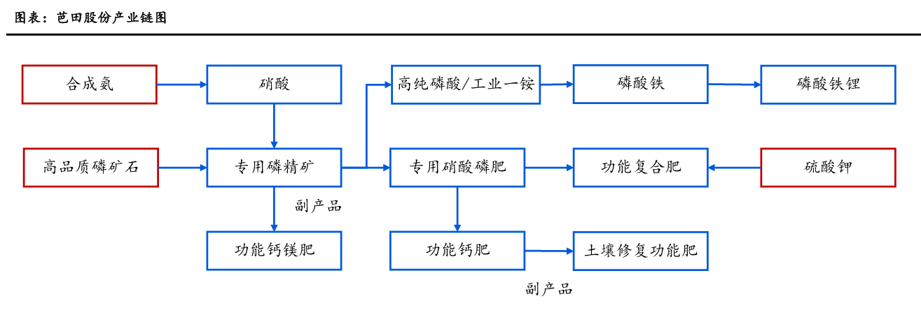 芭田股份前身为深圳京石多元复合肥厂,成立于1989年,于2007年在深交所上市,是中国复合肥行业里第一家上市公司。上市后,芭田股份持续深耕新型复合肥和硝酸磷肥的生产,试验开发了上百种化肥配方,旗下拥有多个品牌,满足了95%以上的国内主要农作物品种的施肥需求。公司依托贵州优质的磷矿资源,积极打通上下游产业链,实现了从原材料到终端产品的全链条覆盖。2020年公司取得贵州小高寨磷矿采矿权,2021年公司新注册贵州芭田新能源材料有限公司,进军新能源领域。通过这一系列战略布局,芭田股份已初步实现从采矿、选矿、磷酸、磷酸盐到新能源的全产业链贯通,为公司磷资源的高效利用及新能源业务的双主业发展奠定了坚实的技术基础。积极进行产业链布局,巩固市场竞争优势。公司依托贵州优质磷矿资源,打造了磷精矿、硝酸磷肥、功能钙肥、功能钙镁肥、土壤修复功能肥等健康农业用肥+磷化工的产业链。此外,公司抓住新能源材料市场发展机遇,加快实现磷产业转型升级,优化产业结构,形成“磷矿—磷酸—磷酸铁”的完整产业链。