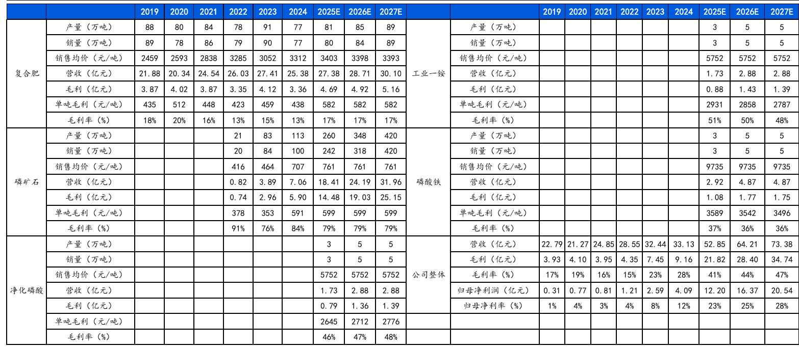根据公司的产能结构来看,公司主要产能是磷矿石和复合肥产能,公司有191万吨复合肥和290万吨磷矿石,公司主要盈利点在磷矿石上,290万吨产能,可以超产20%计算,按早全年300-350万吨产能,销量300万吨,单吨毛利400元,毛利在12亿元左右,叠加复合肥产量在80-90万吨,一半开工率,毛利在4.6亿左右。根据机构测算,2025年全年印绶在52.8亿左右,全年净利润在12亿左右,给10倍估值,看120亿市值合理区间。目前2025年中报预告,公司实现净利润在4.5-5.2亿利润,增长200%左右。我们认为下半年公司拿到开采证书后,产能完全打满后,下半年年利润有望做到6个亿左右。