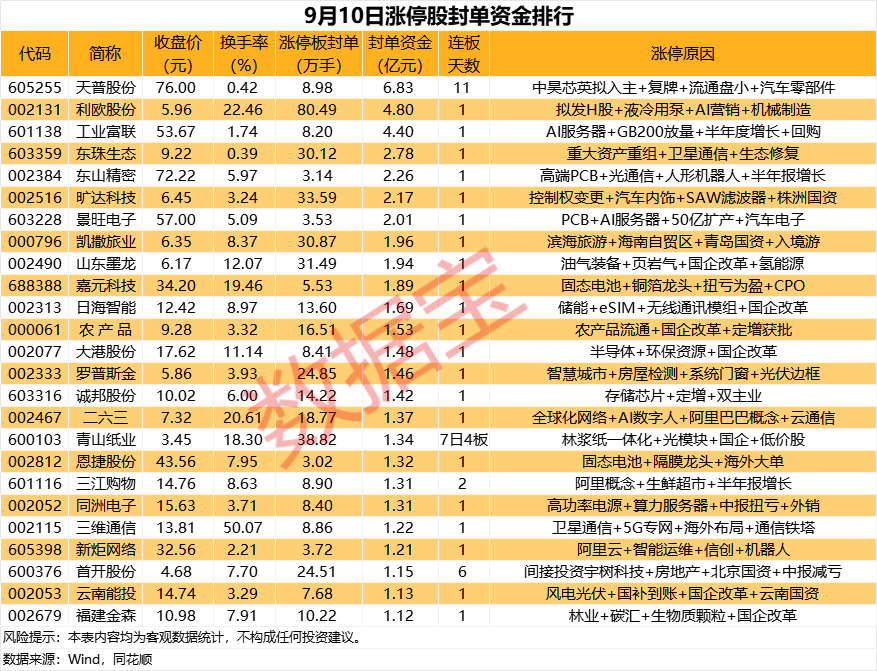 以封单金额计算,30股封单资金均超1亿元,天普股份、利欧股份、工业富联封单资金居前,分别为6.83亿元、4.8亿元、4.4亿元。