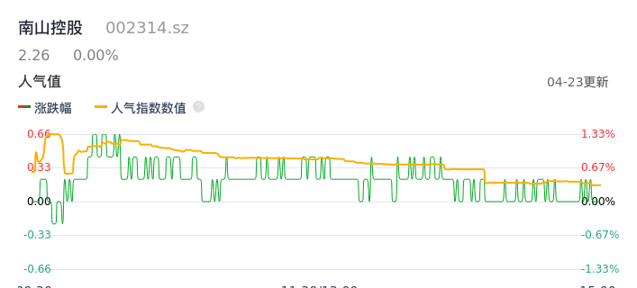 04月23日,南山控股收报2.26,股价涨幅0.00%,成交金额2538.81万元,换手率0.84%。