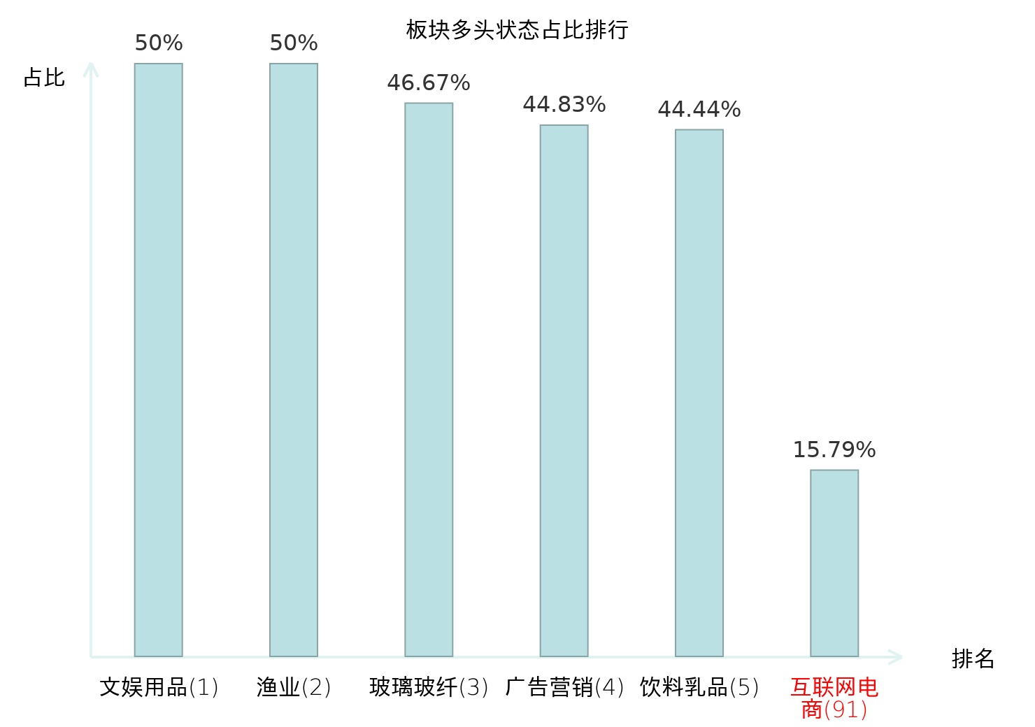 全市场所有行业板块中主力多头状态占比排名中,文娱用品板块位居第一。饮料乳品板块名次提升最快,较昨日上升59位。