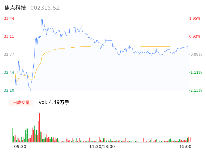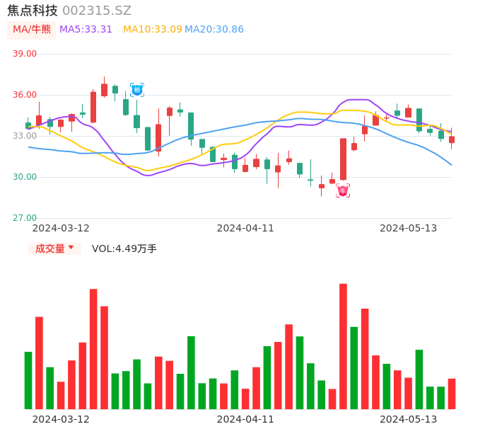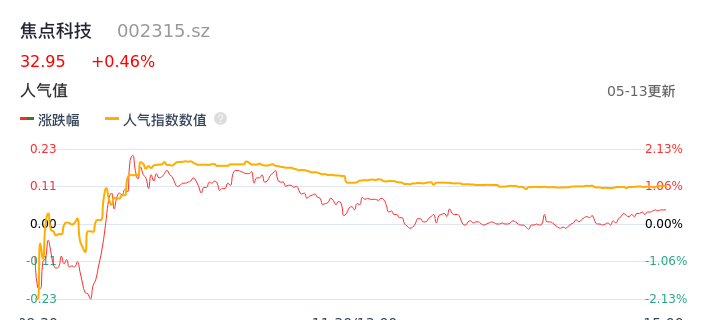05月13日,焦点科技收报32.95,股价涨幅0.46%,成交金额1.48亿元,换手率2.22%。