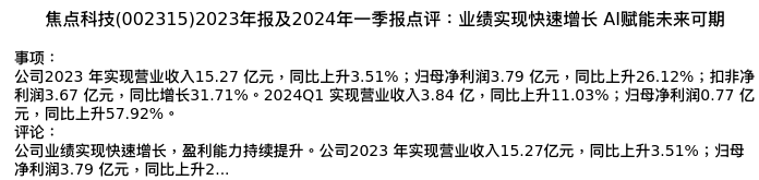 值得注意的是:2024年05月华创证券的吴鸣远/王薇娜分析师,首次发布关于焦点科技的研究报告,标题为:焦点科技(002315)2023年报及2024年一季报点评:业绩实现快速增长 AI赋能未来可期。