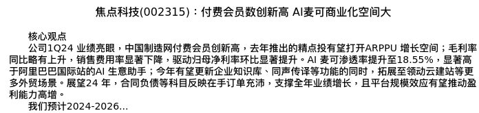 值得注意的是:2024年05月中信建投证券的杨艾莉分析师,首次发布关于焦点科技的研究报告,标题为:焦点科技(002315):付费会员数创新高 AI麦可商业化空间大。