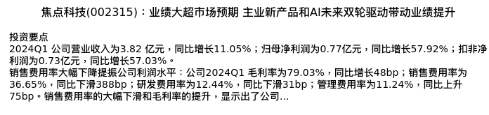 值得注意的是:2024年04月东吴证券的张良卫/张家琦/戴晨分析师,首次发布关于焦点科技的研究报告,标题为:焦点科技(002315):业绩大超市场预期 主业新产品和AI未来双轮驱动带动业绩提升。