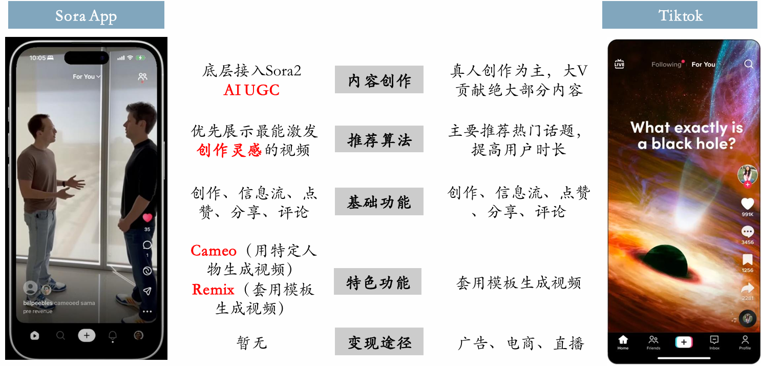 爆款应用的背后,是更强的用户时长获取能力,Sora App通过社交关系和UGC来获取用户时长。Tiktok/抖音、Instagram等传统社交应用通过更优质热门内容和社交黏性获取用户时长,而Sora App则聚焦普通用户的社交关系链和创作意愿,通过激发用户的创作热情来获取用户时长。