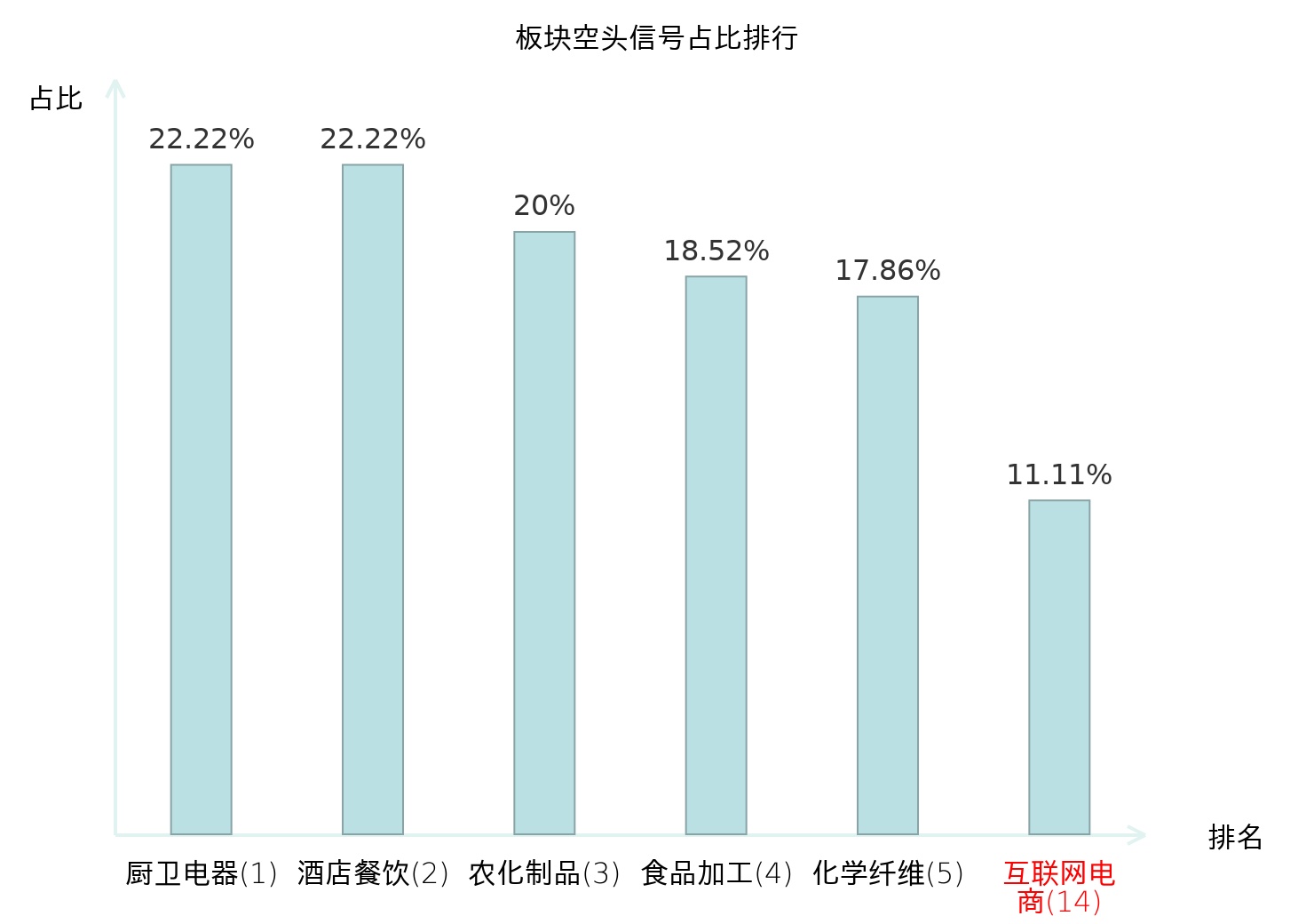 全市场所有行业板块中主力空头信号占比排名中,厨卫电器板块位居第一。化学纤维板块名次提升最快,较昨日上升119位。