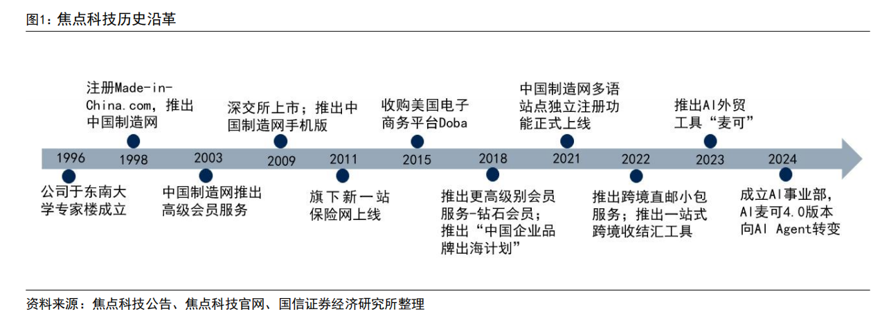 公司成立于1996年,总部位于南京,主营全链路综合外贸B2B服务。重点依托于1998年推出的“中国制造网”平台,该平台为双方国际贸易的达成提供一站式外贸服务,包括店铺展示、推广引流、商机推动、认证服务、CRM客户关系管理等。以及公司构建了涵盖跨境电商业务、线上线下融合的保险代理业务等。