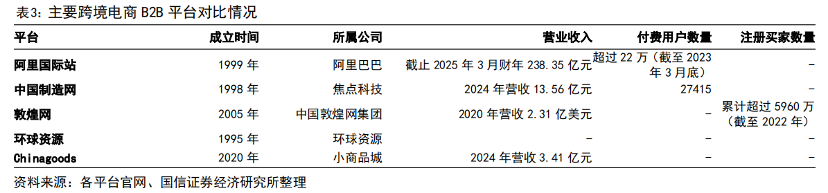 焦点科技旗下中国制造网注册买家数量2000万+,拥有来自27个行业的7000多万条产品信息,2024年营收13.56亿元,同比增长8.78%。整体综合实力预计在行业排名第二,仅次于阿里国际站。