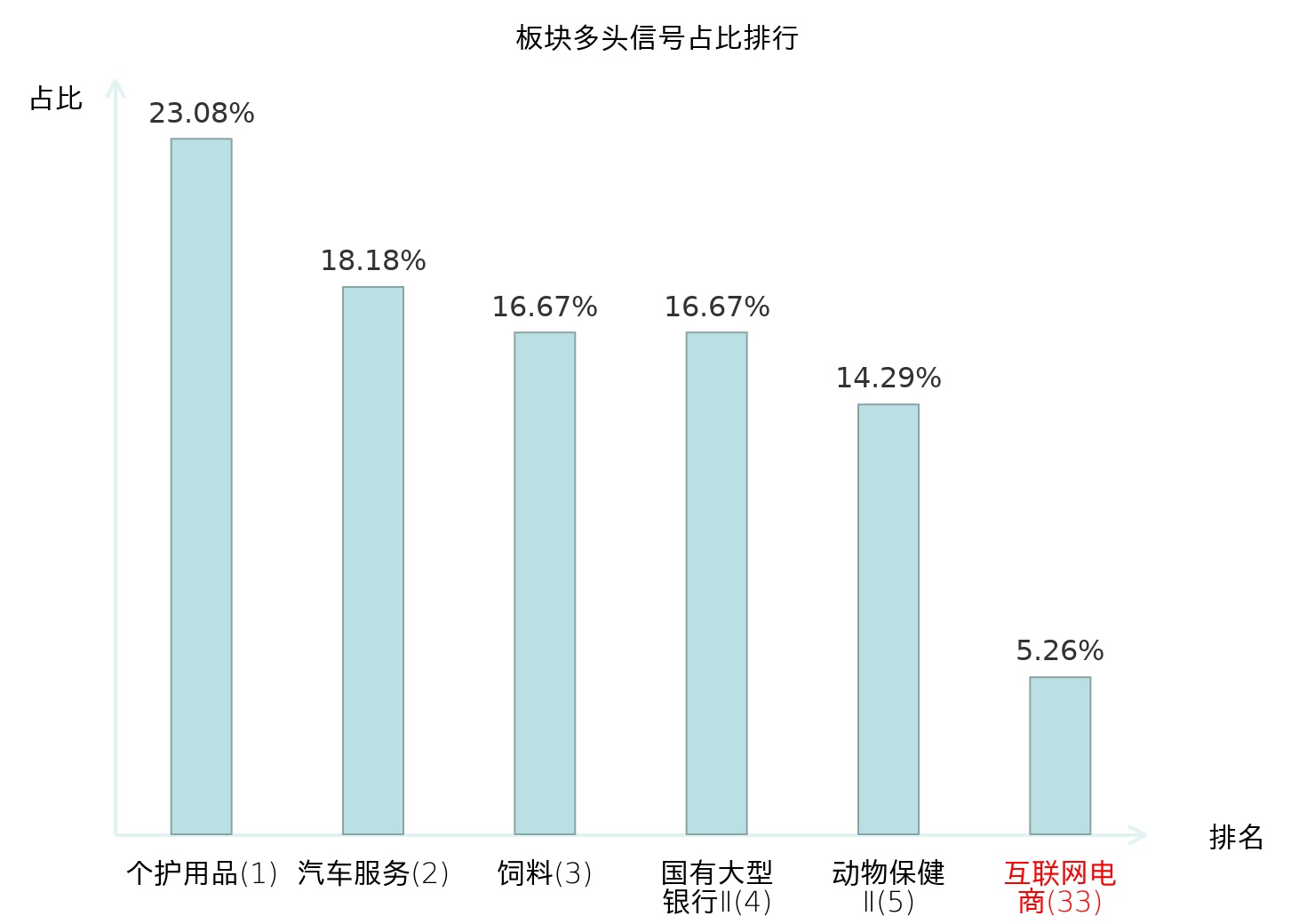 全市场所有行业板块中主力多头信号占比排名中,个护用品板块位居第一。国有大型银行Ⅱ板块名次提升最快,较昨日上升119位。