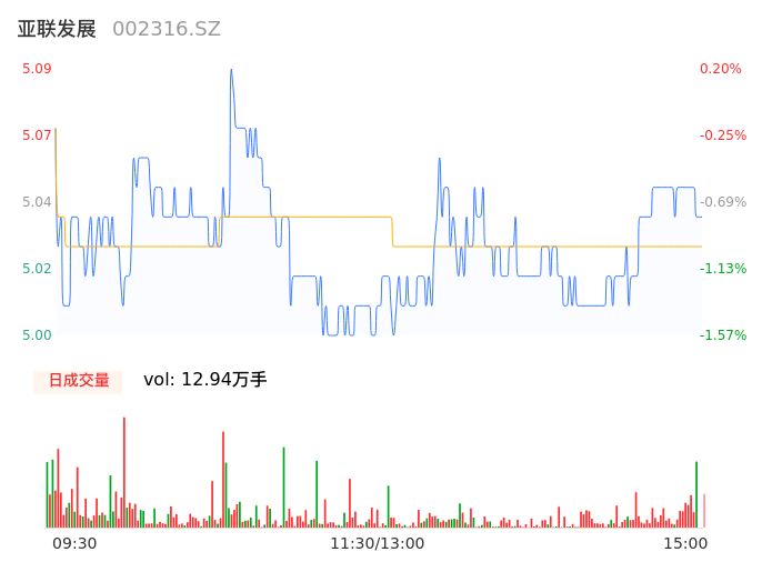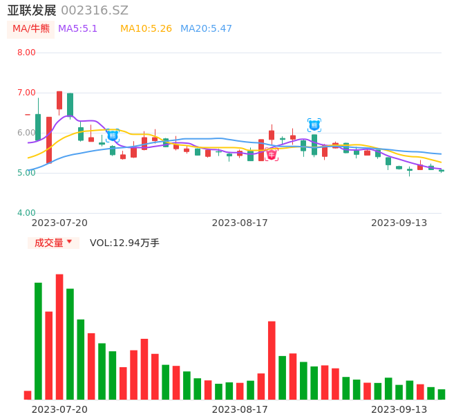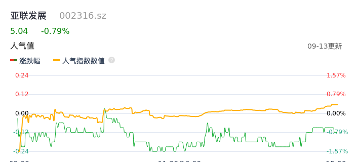09月13日,亚联发展收报5.04,股价涨幅-0.79%,成交金额6511.08万元,换手率4.11%。