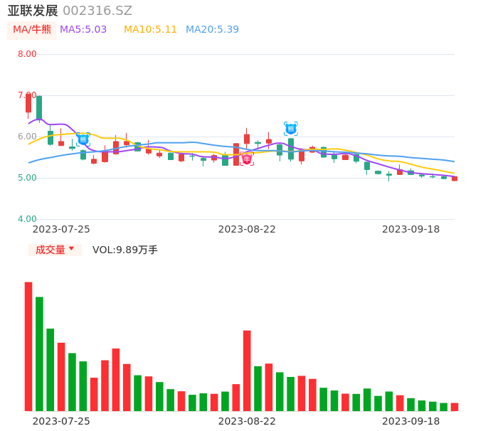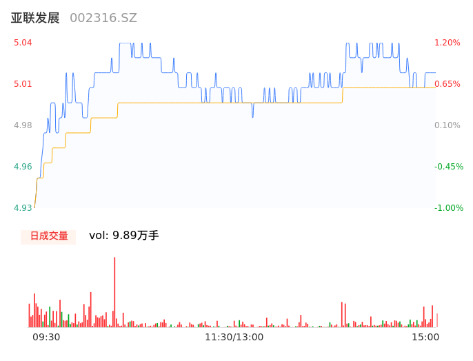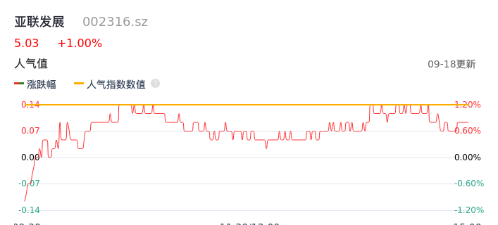 09月18日,亚联发展收报5.03,股价涨幅1.00%,成交金额4951.80万元,换手率3.14%。