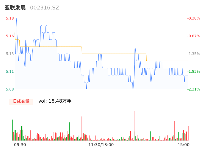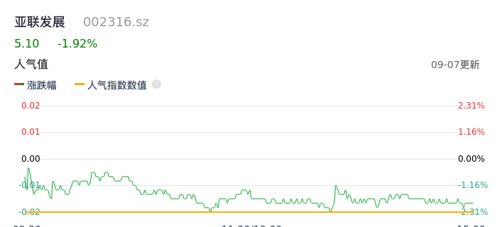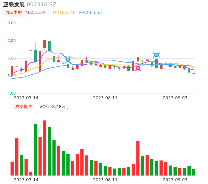 09月07日,亚联发展收报5.10,股价涨幅-1.92%,成交金额9459.28万元,换手率5.87%。