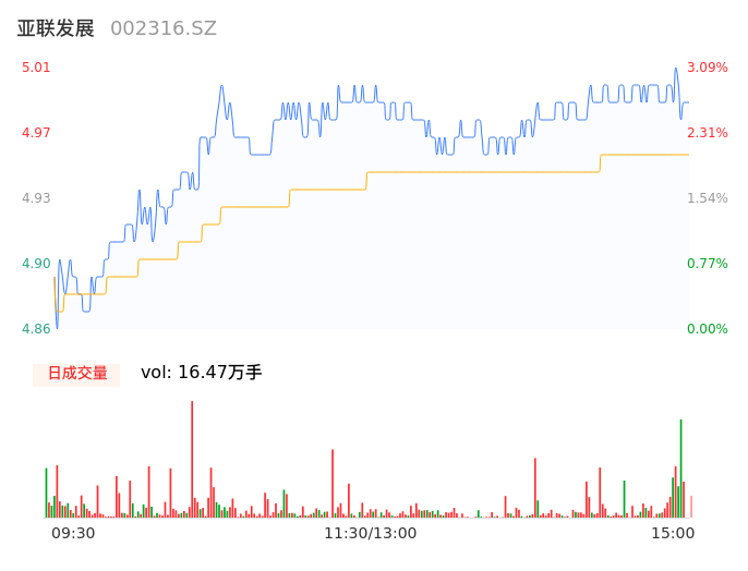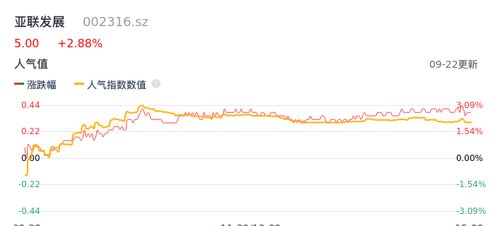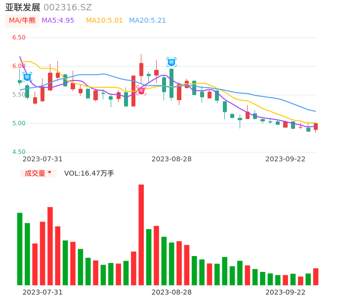 09月22日,亚联发展收报5.00,股价涨幅2.88%,成交金额8173.10万元,换手率5.23%。