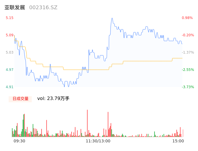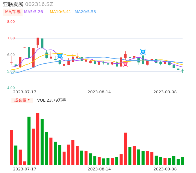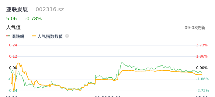 09月08日,亚联发展收报5.06,股价涨幅-0.78%,成交金额1.19亿元,换手率7.55%。