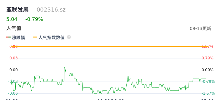 09月13日,亚联发展收报5.04,股价涨幅-0.79%,成交金额6511.08万元,换手率4.11%。