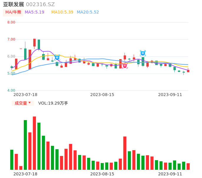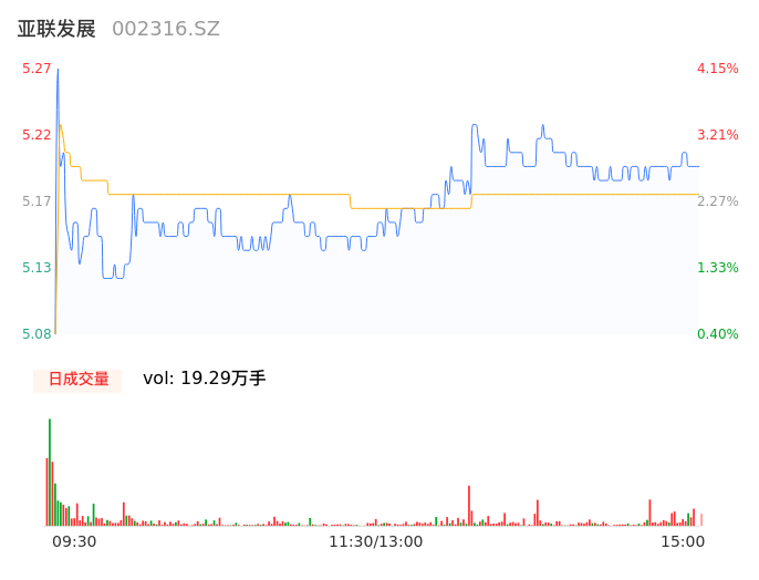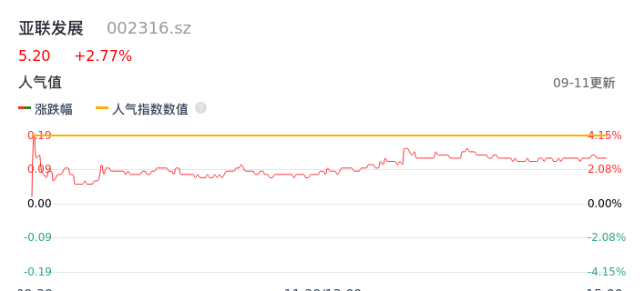 09月11日,亚联发展收报5.20,股价涨幅2.77%,成交金额1.00亿元,换手率6.13%。