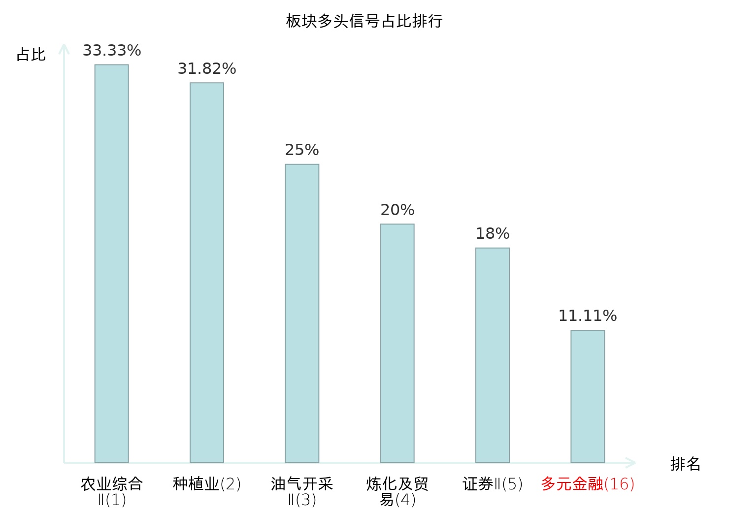 全市场所有行业板块中主力多头信号占比排名中,农业综合Ⅱ板块位居第一。农业综合Ⅱ板块名次提升最快,较昨日上升127位。