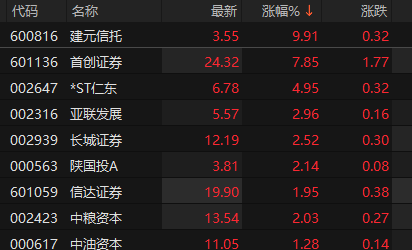 上证报中国证券网讯 9月17日早盘,非银金融板块拉升,截至9时59分,建元信托涨停,首创证券涨近8%,亚联发展、长城证券、信达证券等涨幅靠前。