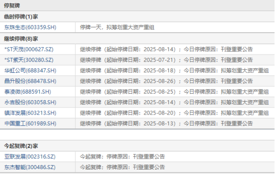 上证报中国证券网讯 8月27日,1家公司临停:东珠生态,2家公司复牌:亚联发展、东杰智能。