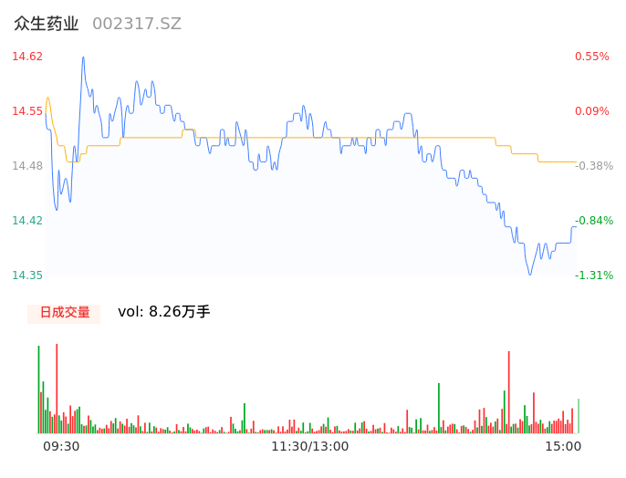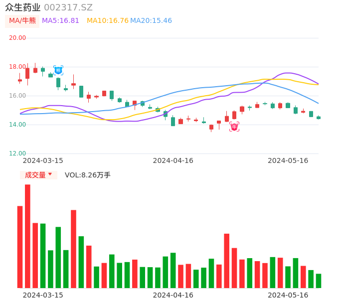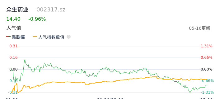 05月16日,众生药业收报14.40,股价涨幅-0.96%,成交金额1.20亿元,换手率1.08%。