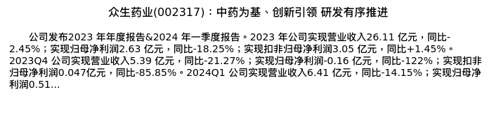 值得注意的是:2024年05月国盛证券的张金洋/胡偌碧分析师,首次发布关于众生药业的研究报告,标题为:众生药业(002317):中药为基、创新引领 研发有序推进。
