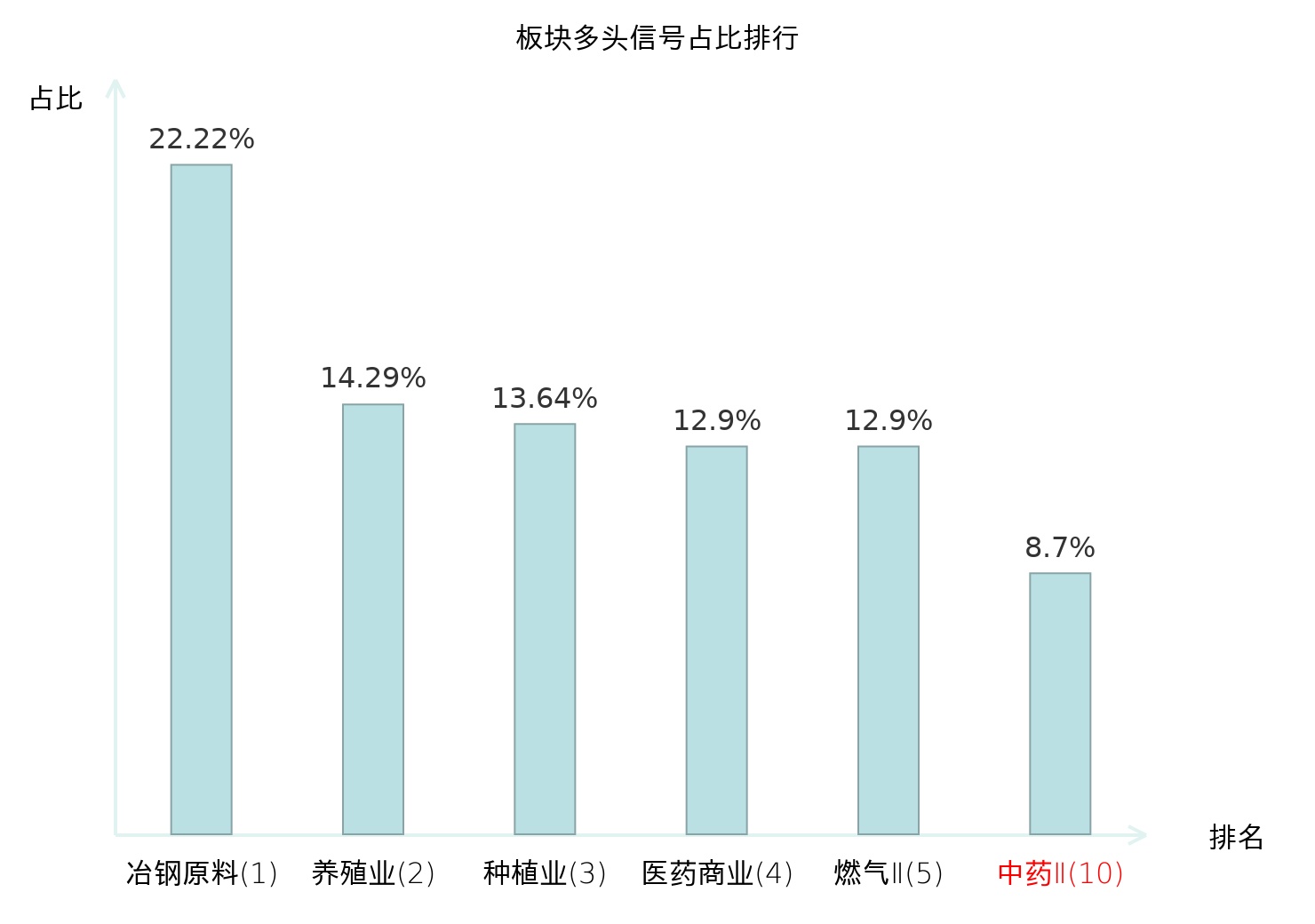 全市场所有行业板块中主力多头信号占比排名中,冶钢原料板块位居第一。航天装备Ⅱ板块名次提升最快,较昨日上升114位。