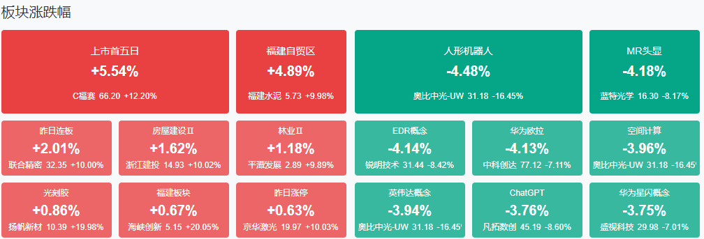 板块方面,福建自贸区、光刻胶、煤炭、港口等板块涨幅居前,英伟达概念、星闪概念、ChatGPT、CPO等板块跌幅居前。