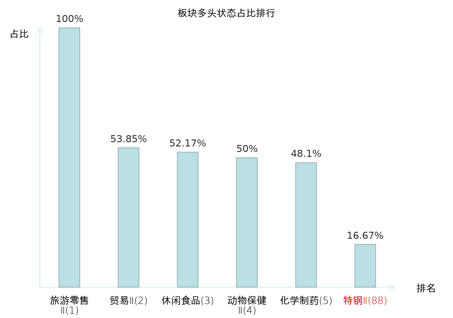 全市场所有行业板块中主力多头状态占比排名中,旅游零售Ⅱ板块位居第一。白酒Ⅱ板块名次提升最快,较昨日上升47位。