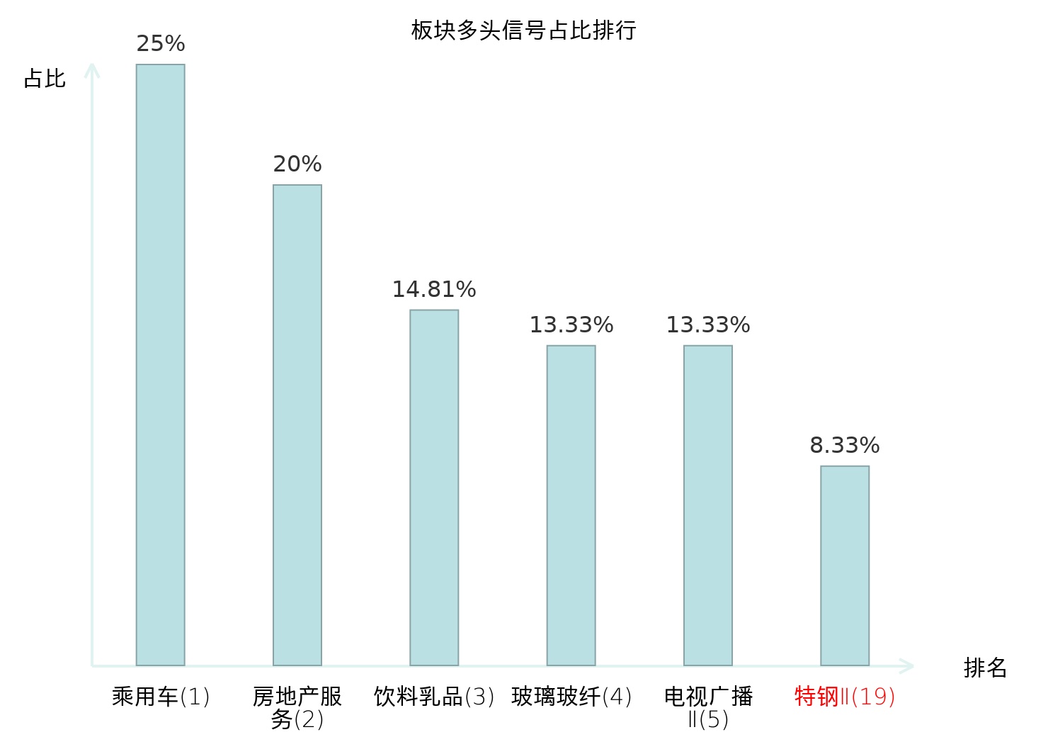 全市场所有行业板块中主力多头信号占比排名中,乘用车板块位居第一。乘用车板块名次提升最快,较昨日上升117位。