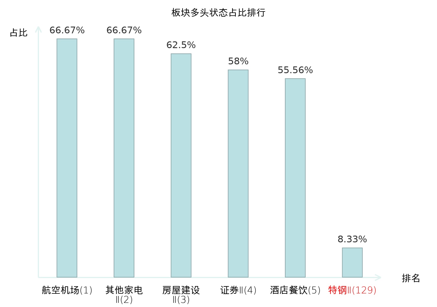 全市场所有行业板块中主力多头状态占比排名中,航空机场板块位居第一。装修建材板块名次提升最快,较昨日上升62位。