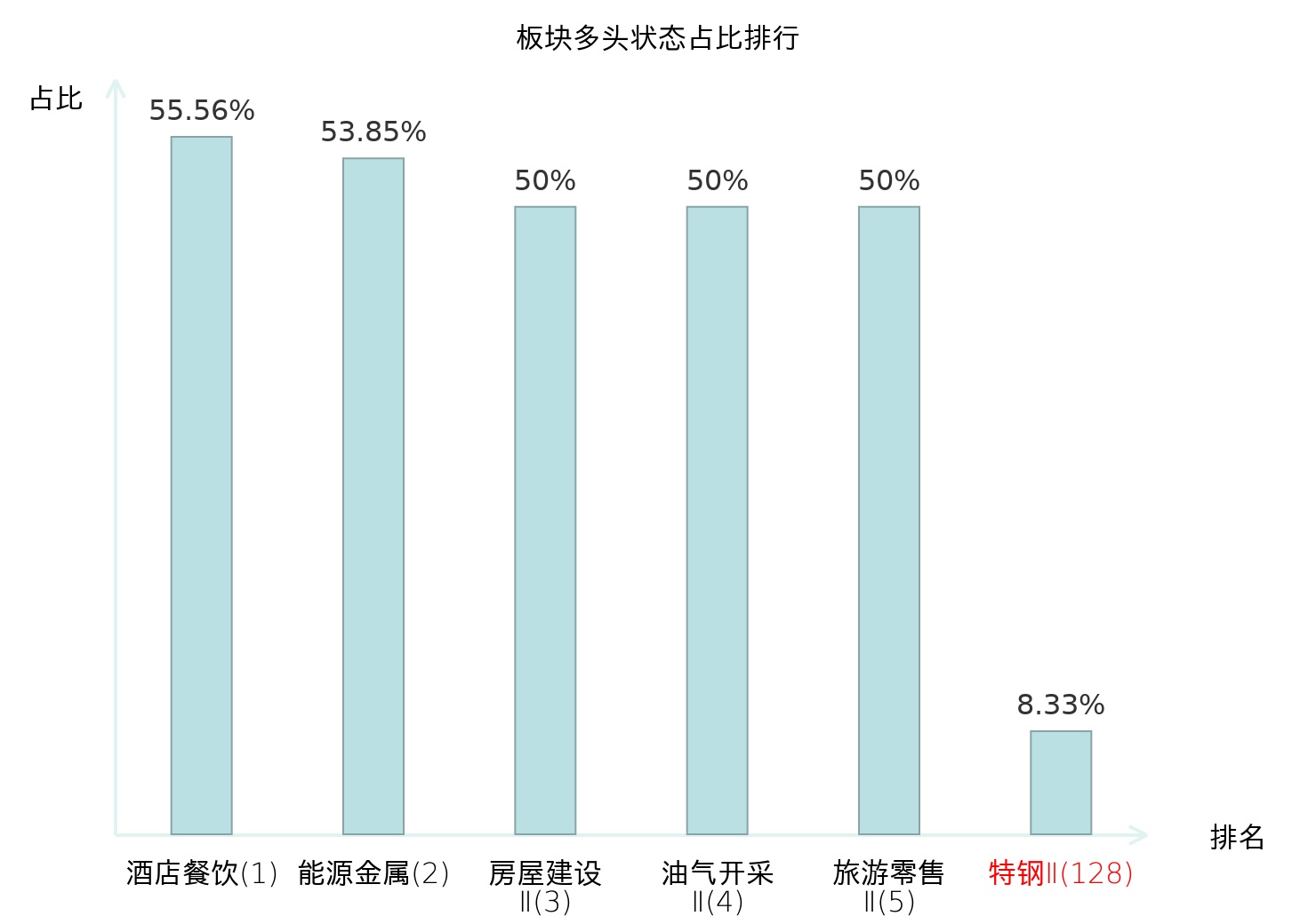 全市场所有行业板块中主力多头状态占比排名中,酒店餐饮板块位居第一。饰品板块名次提升最快,较昨日上升84位。