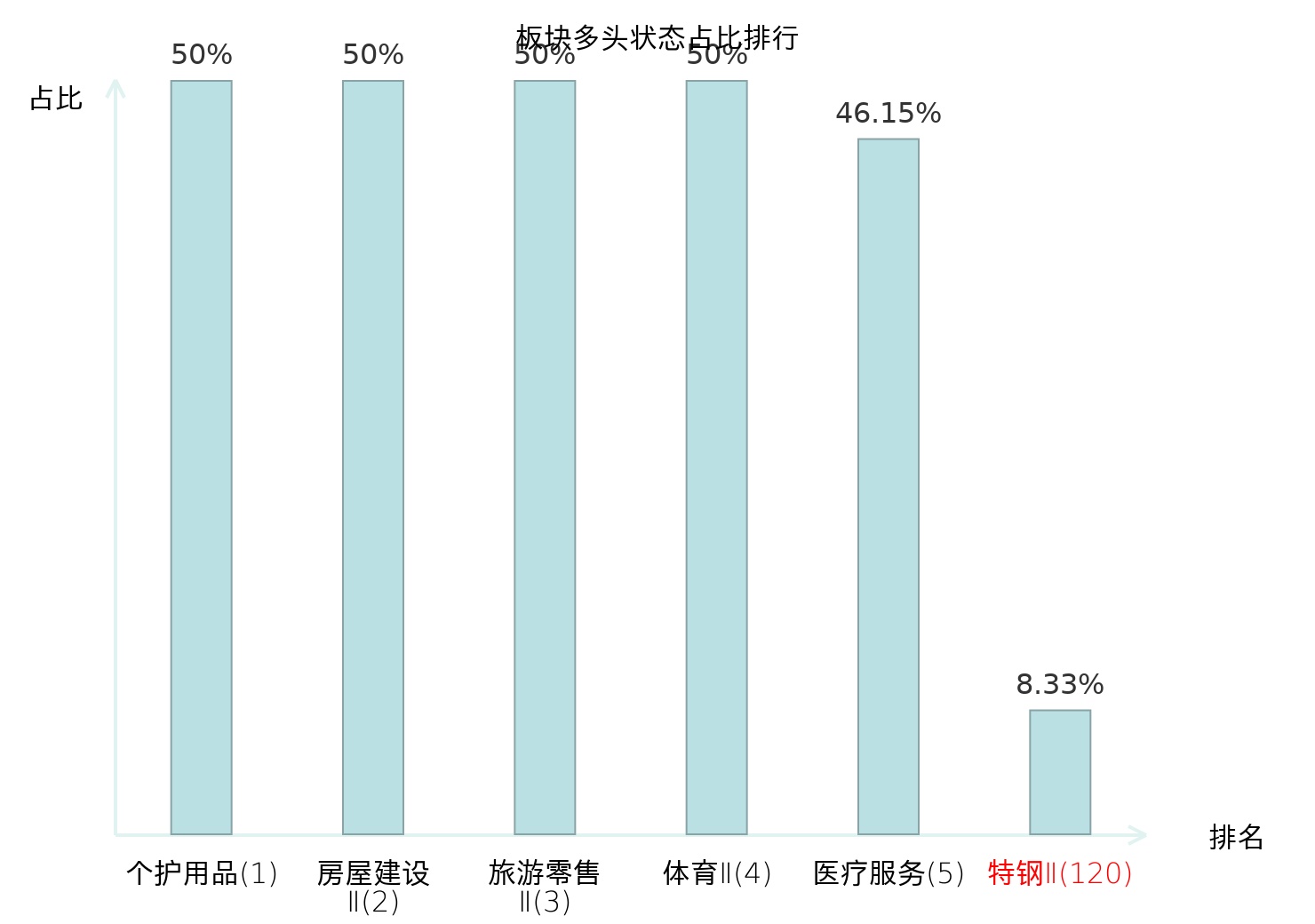 全市场所有行业板块中主力多头状态占比排名中,个护用品板块位居第一。影视院线板块名次提升最快,较昨日上升56位。
