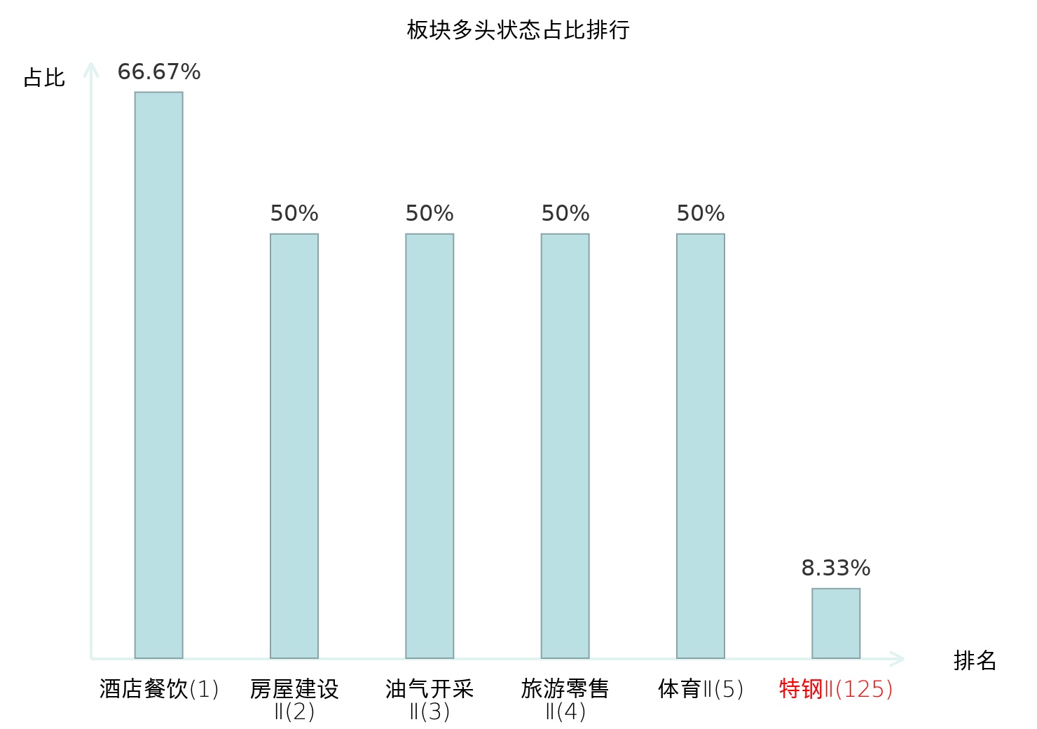 全市场所有行业板块中主力多头状态占比排名中,酒店餐饮板块位居第一。农商行Ⅱ板块名次提升最快,较昨日上升50位。