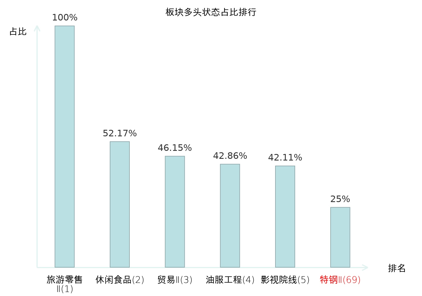 全市场所有行业板块中主力多头状态占比排名中,旅游零售Ⅱ板块位居第一。体育Ⅱ板块名次提升最快,较昨日上升99位。