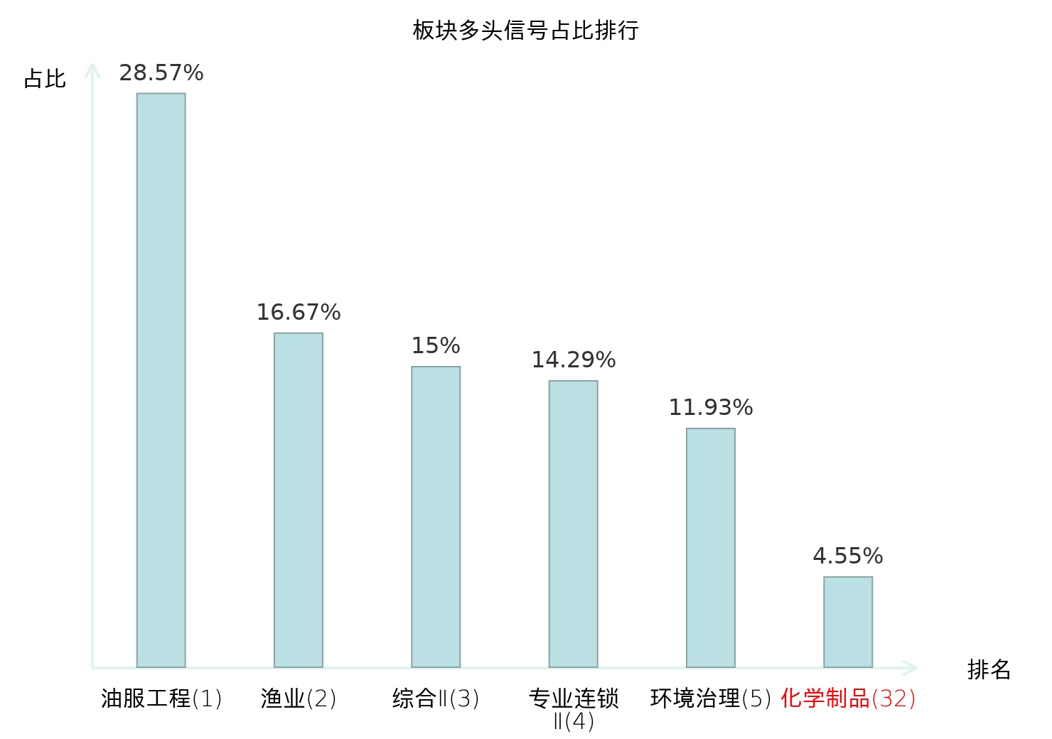 全市场所有行业板块中主力多头信号占比排名中,油服工程板块位居第一。房地产服务板块名次提升最快,较昨日上升110位。