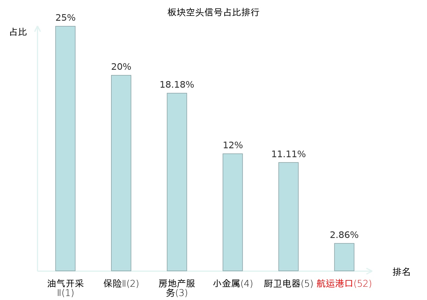 全市场所有行业板块中主力空头信号占比排名中,油气开采Ⅱ板块位居第一。装修建材板块名次提升最快,较昨日上升117位。